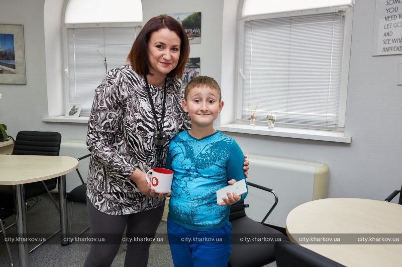 Сьогодні Ольга Дем'яненко вручила Ганні і її синові Кирилу, який був головним героєм постів мами, приз від компанії-партнера - брендову чашку і зарядний пристрій (пауербанк).